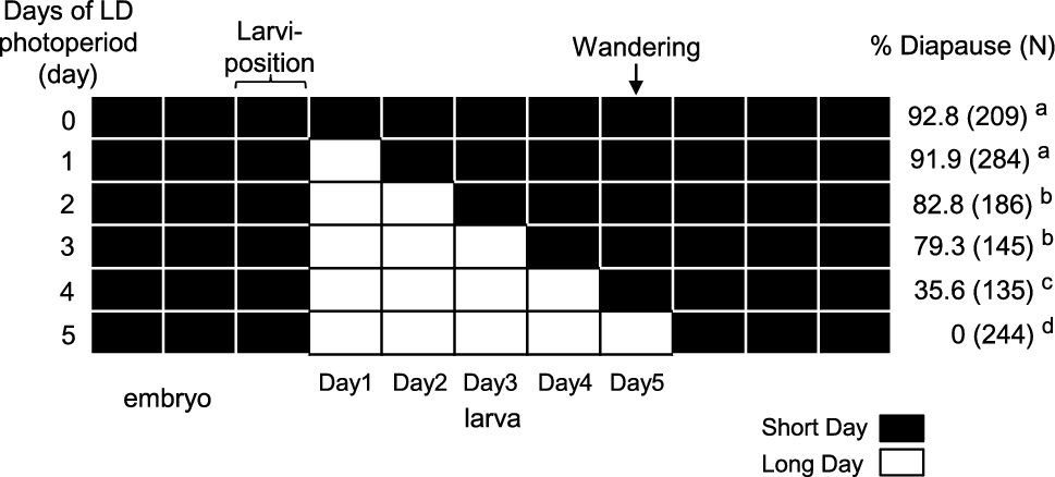 Tests were run in July 2023 on beetles obtained from the bark samples described above and gradually taken to laboratory room temperature (26 –29 °C), as they were leaving the overwintering conditions. Only beetles that showed a standard activity of movement were selected for the tests 2 h after they reached the room temperature under laboratory light conditions. The experiments were run between 11:30 and 15:00. Each individual was given a maximum of 10 min for the test. Beetles were first placed individually in the dark part of the basal corridor for 1 min. Once the sliding door was open, the test started, and notes of movements were taken during the experiment. A clear final choice was declared after the individual spent at least 1 min continuously at the end of the same arm of the maze as already done in behavioural choice experiment by Netherer et al. (2022). The measure considered for all the experiments is the time (expressed in seconds) used by beetle to reach the arm. The tests included: (i) green light vs. no light, (ii) UV light vs. no light, (iii) UV vs. green light with 1:4 quantal flux ratio, (iv) UV vs. green light with 1:1 quantal flux ratio, (v) UV vs. green light with 1:16 quantal flux ratio. The light sources were randomly alternated between the two arms for each individual tested. Only naïve beetles were used, for a total of 10 females and 10 males in each test.